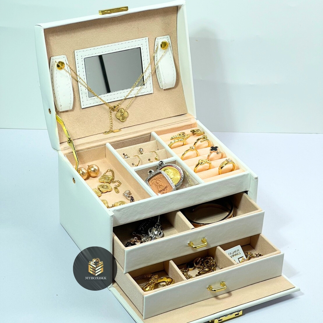 กล่องหนังหูหิ้วจัดเก็บเครื่องประดับ 3ชั้น สีขาว